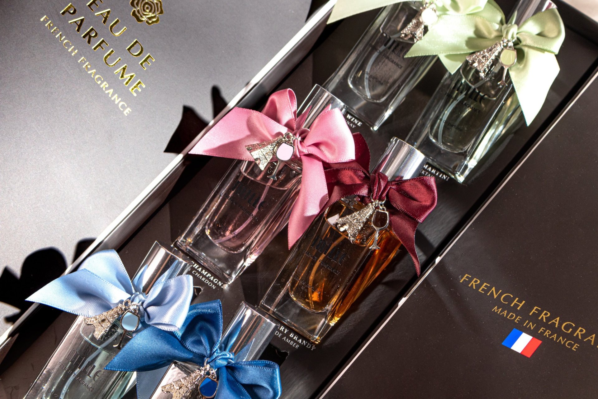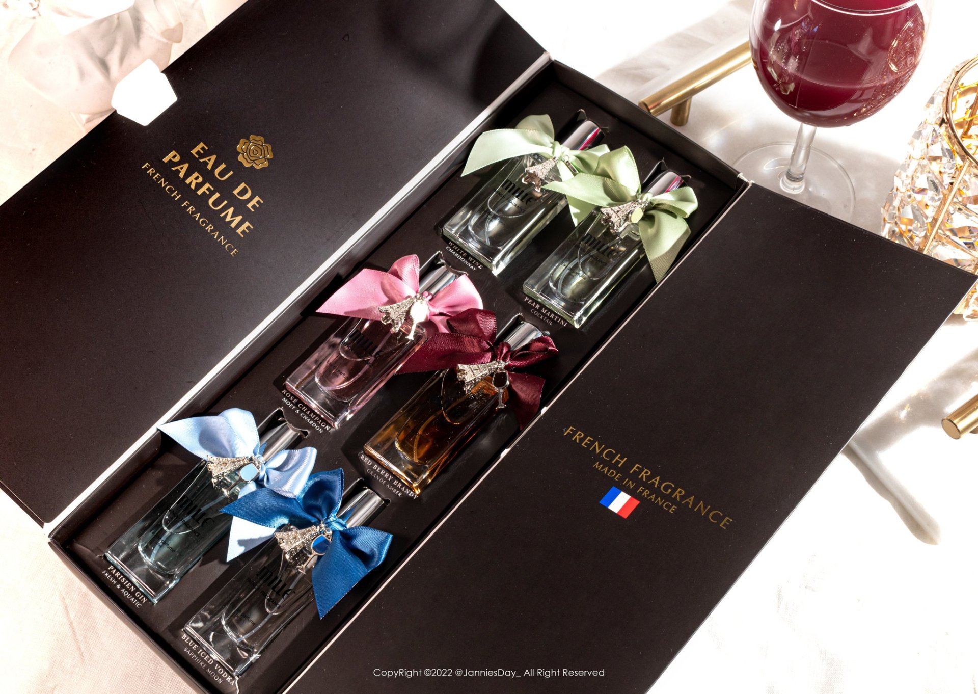 แล้วพูดหน่อยกิมมิคเค้าน่ารัก อย่างตัวกล่องคือเลียนแบบกล่องขวดไวน์อ่ะ แถมเค้าทำ Charm ที่ติดฝาขวดมาน่ารักมากกก เป็นตัวหอไอเฟลกับแก้วไวน์ตามสีอ่ะ น่ารักจริง พอมาวางเรียงกันคือน่ารักมั่ก